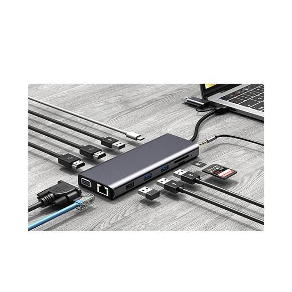 USB 3.1 C to USB3.0 X 2 +USB2.0 X 2+ 2*HDMI +VGA+ GIGA LAN + SD/TF Card Reader + Audio/MIC + TYPE-C PD3.0 100W