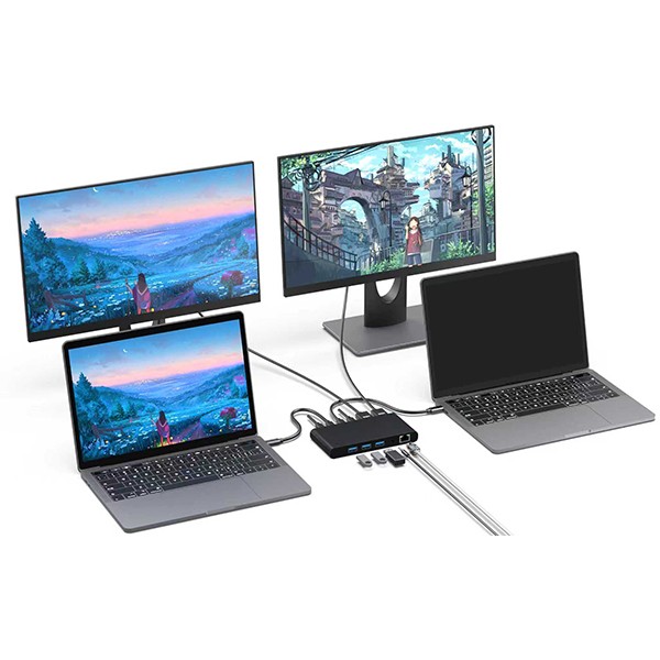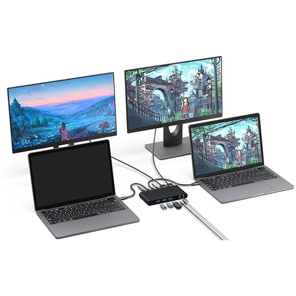 Two PD charging ports allow charging for both laptops simultaneously.